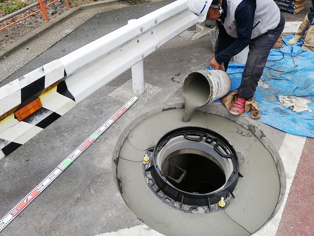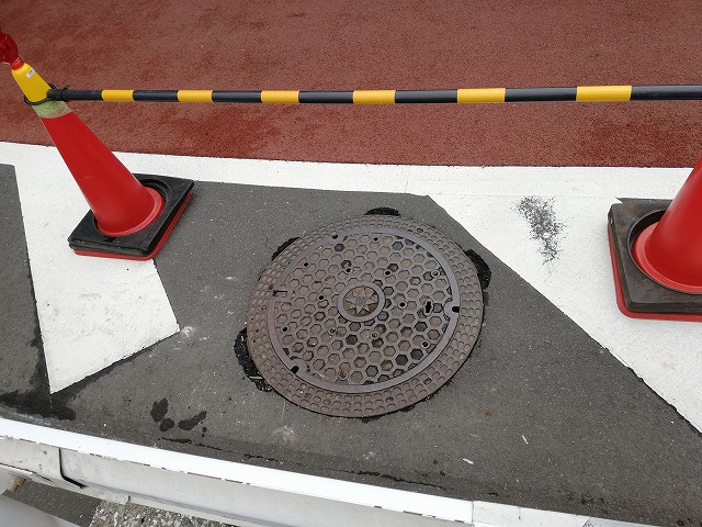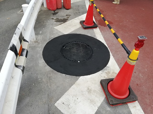 台風で破損したマンホール蓋を緊急補修しました。速乾性の材料を使い約3時間後には車が通れるようになりました。