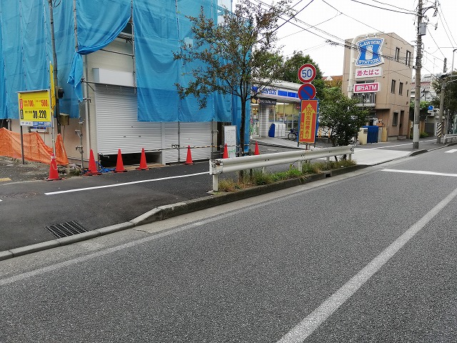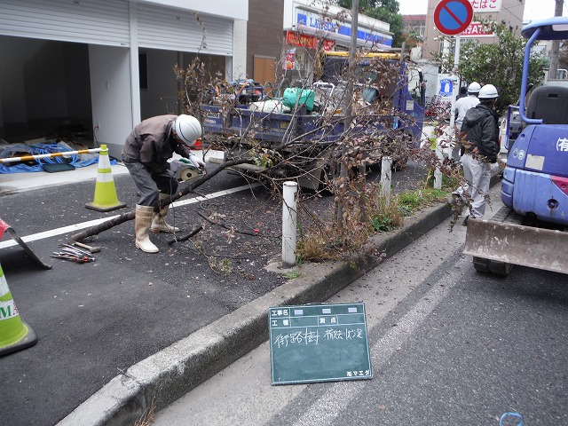 既存のガードレール、街路樹を撤去します。街路樹は別途指定された公園に新たにソメイヨシノを植えました。