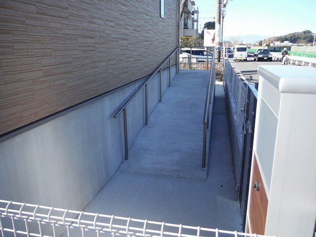 台車等で荷物を楽に運べるように、スロープの傾斜を緩く施工しました。